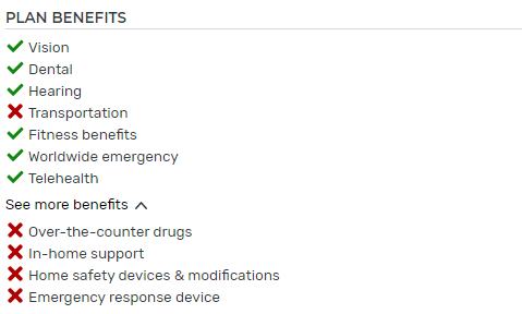 - Non-filterable checkmark benefits (six in total): MPF users cannot filter plans based on these benefits. They are worldwide emergency, telehealth, over-the-counter (OTC) drugs, in-home support, home safety devices & modifications, and emergency response device benefits.