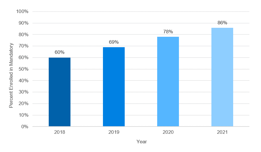 FIGURE 2: PERCENTAGE OF TOTAL MA PLAN ENROLLMENT IN PLANS WITH MANDATORY DENTAL BENEFITS4