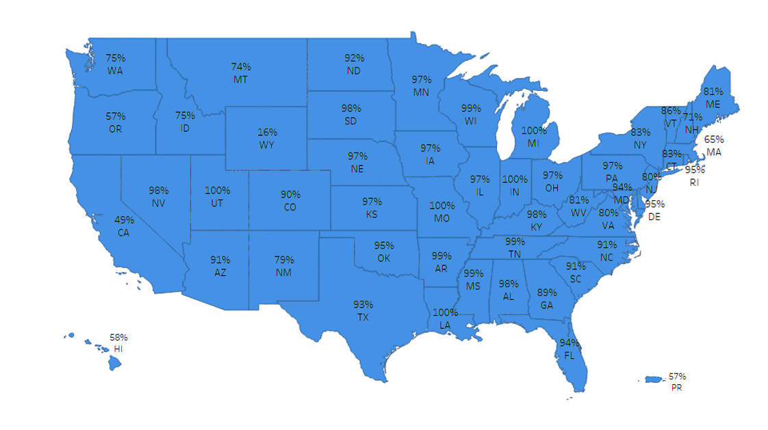Looking across states, we see that enrollment in MA plans with mandatory dental benefits is increasing across the board. In the past, there were no states with 100% of their MA plan enrollees enrolled in plans with mandatory dental. For 2021, there are six states or districts with 100% enrollment in plans with mandatory dental benefits: the District of Columbia, Indiana, Louisiana, Michigan, Missouri, and Utah (see Figure 2). Last year, there were fewer than 20 states with more than 90% of MA enrollees in plans with mandatory dental coverage; this year there are over 30, which shows that enrollment in MA plans with mandatory dental benefits is indeed growing in popularity.